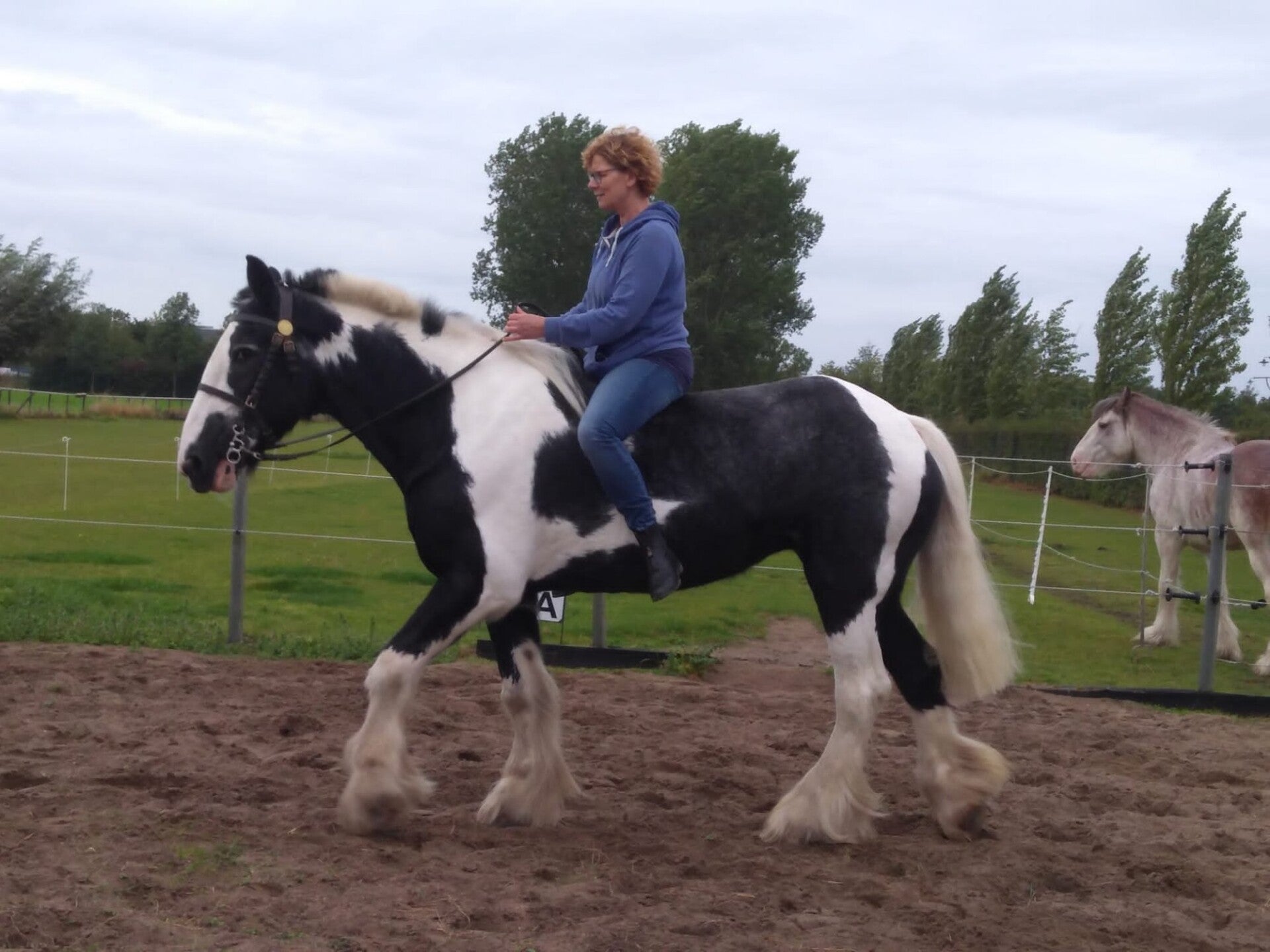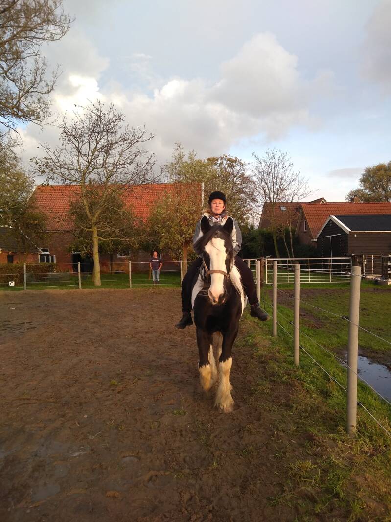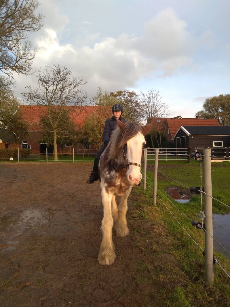 "Het duurde allemaal lang voor Mose, mijn kleindochter die helemaal gek is op paarden. Zeker ook grote paarden, zoals de Clydesdales. Uiteindelijk was het moment daar en gingen we op pad om met name Kelly weer te zien. Kelly stond met Blossom en de nieuwe merrie in de wei. Eerst alles begroet en een wortel gegeven. Toen mocht Mose Kelly naar stal brengen om te gaan borstelen. En zonder enige vorm van angst nam zij de grote bonte mee. Trots als een pauw, want Mose voelt zich de ‘eigenaar’ van Kelly. Op stal gepoetst en geknuffeld. En er natuurlijk ook op. Ingrid had een handige singel met beugel om aan vast te houden en zo stapte de trouwe zwart witte Clydesdale met de kleine ukkepuk op haar rug door de bak. Wat zat ze te genieten. Glunderend reed ze met vol vertrouwen een aantal rondjes. Wat is Kelly een ongelofelijk betrouwbaar dier! Na Kelly weer in de wei te hebben gezet, zijn we, na lekker wat te hebben gedronken, weer terug gereden. 3 bochten later lag Mose in diepe slaap achter in de auto. Moe en voldaan na een middagje sjouwen met een van die geweldige gentle giants!.