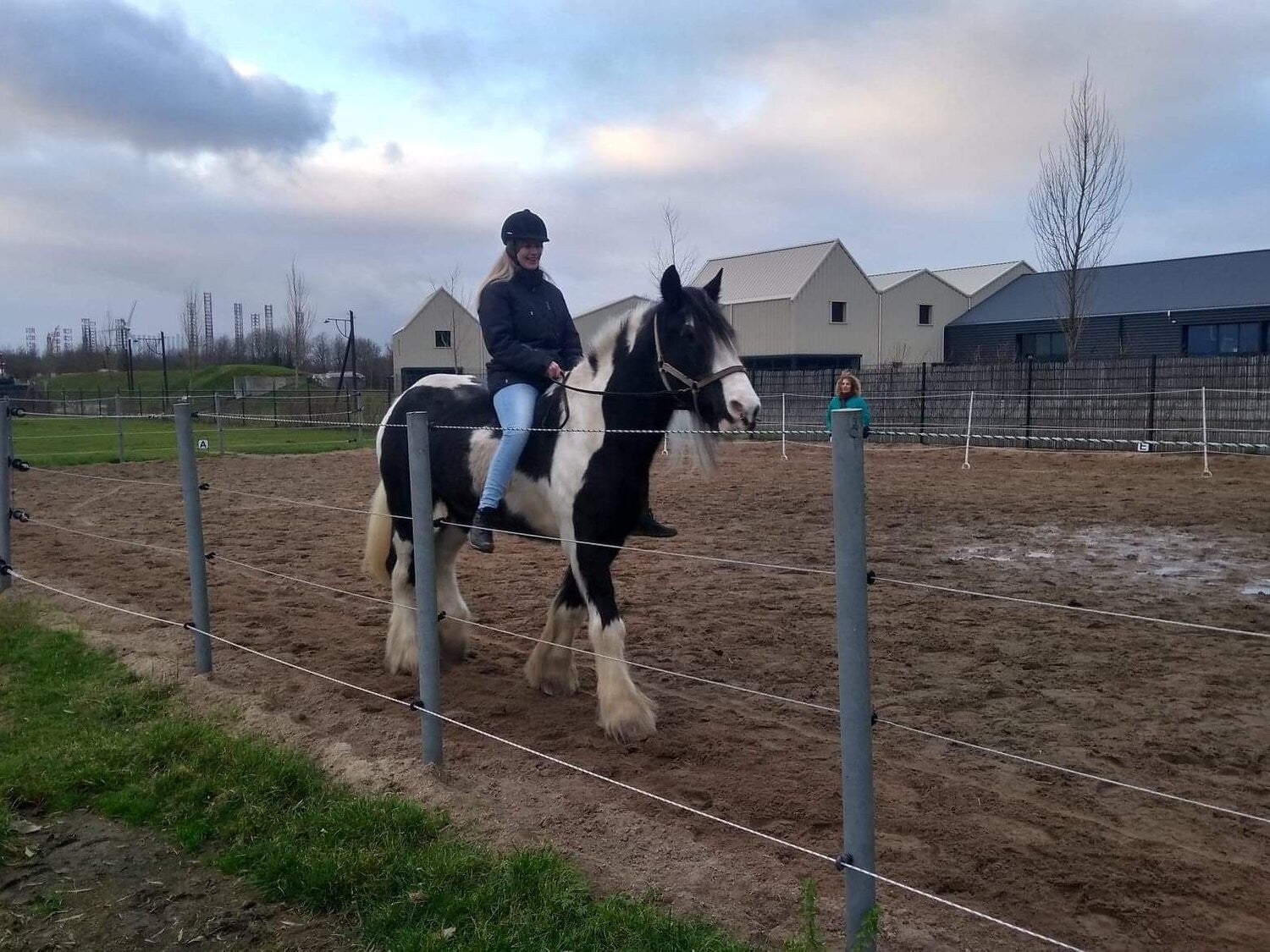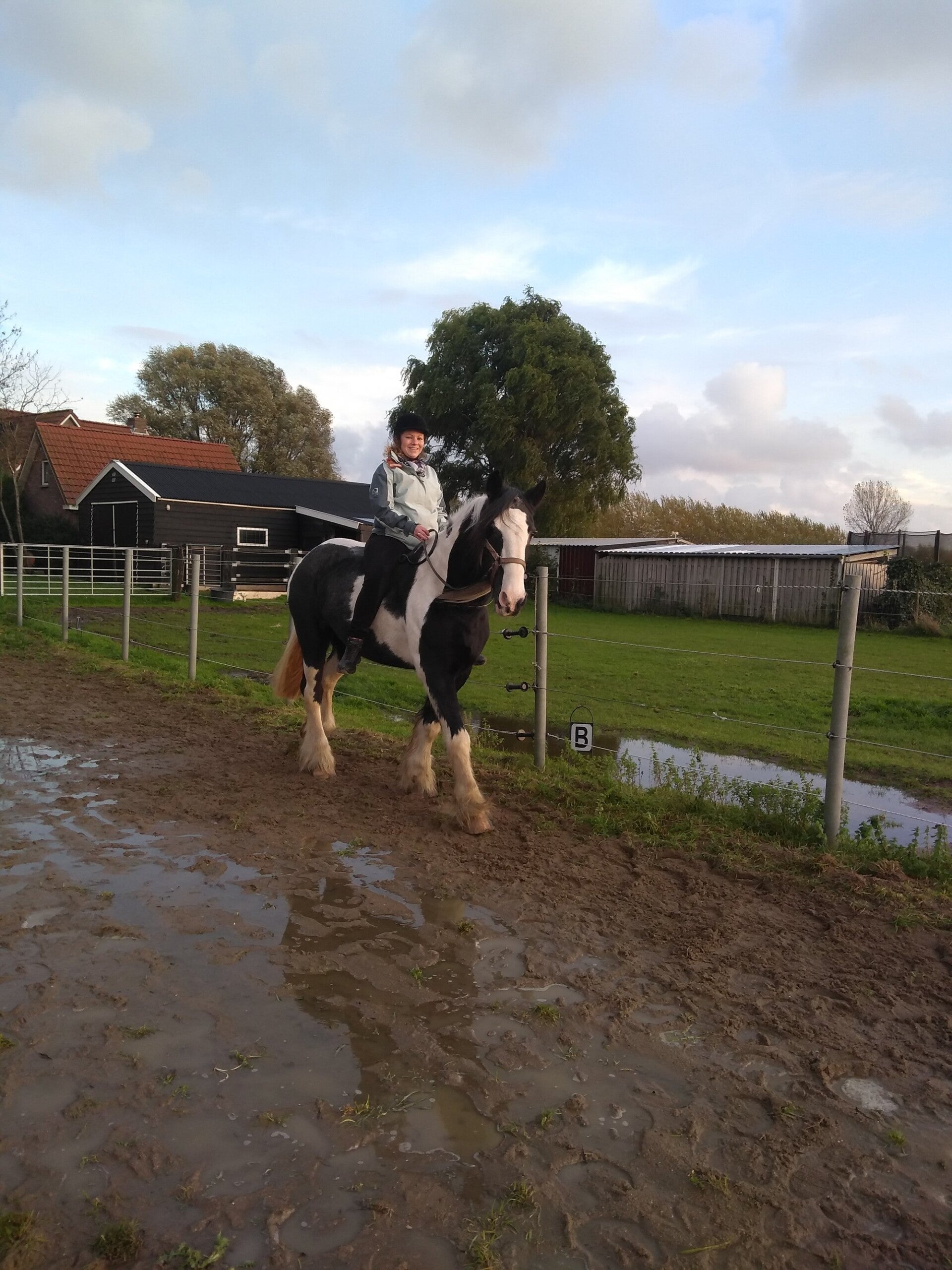 Het bleek te gaan om Jayne een kruising Clydesdale/Shire. Ze stond in Zwitserland. Ingrid heeft eerst zelf nauw contact gehad met de toen huidige eigenaresse, en ons op dingen gewezen om ook zelf te vragen en naar te kijken. Het was voor mijzelf een must om naar Zwitserland te gaan om te zien of de klik er met het paard zou zijn, dat we pas 5 weken later konden was voor de eigenaresse totaal geen probleem, dat was erg fijn! Uiteindelijk was het zover om haar te gaan bekijken, wat was mijn dochter zenuwachtig!!En wat was Ingrid benieuwd en wat leefde ze met ons mee! Maar zoals Ingrid al had voorzien was het gevoel goed en paste ze prima bij ons.Een mooi, lief ,sociaal en rustig beestje. Daar kregen we alle tijd om haar te aaien, poetsen en rijden en geen vraag te gek of te moeilijk. Een week later werd Jayne op transport gezet richting Nederland en wat hebben we in spanning zitten wachten, mede ook omdat het transport net iets anders ging dan verwacht(ik zal het daar maar bij laten)en midden in de nacht was het zover, daar was ze! En ondanks dat onze Sammy houd van rust en afzijdigheid was daar gelijk de interesse voor Jayne en de aanvaarding. De dames staan naast elkaar op stal en de andere dag gelijk samen zonder problemen in de bak en uiteindelijk in de paddock. Door omstandigheden kon Ingrid pas een paar weken later komen kijken naar onze nieuwste aanwinst, dat werd door ons erg gewaardeerd, het medeleven en de interesse.